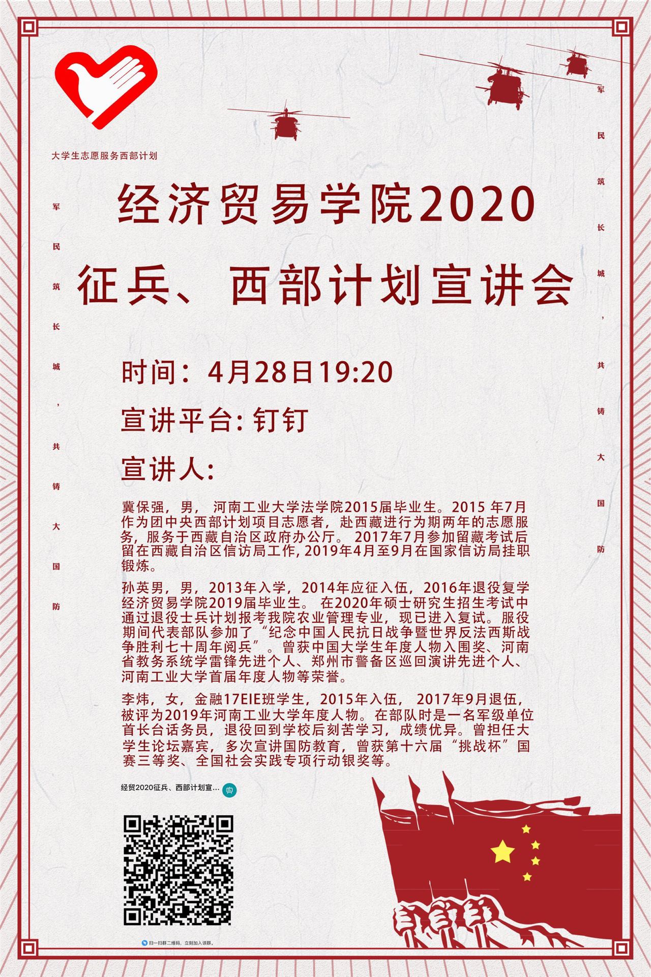 为确保疫情防控期间毕业生就业工作稳步推进,更好地为毕业生提供就业服务,鼓励更多优秀毕业生投身西部、应征入伍,4月28日晚,永利召开线上2020年大学生应征入伍暨西部计划宣讲会。本次会议邀请了留藏优秀志愿者、法学院2015届毕业生冀保强介绍西部计划的相关情况,永利2019届毕业生孙英男、2017级李袆分享入伍经验。院党委副书记王鹏、团委负责人孙玉涵和部分毕业生100余人参加了本次会议。会议由孙玉涵主持。